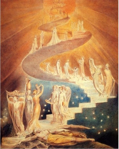 Jacob’s Ladder: note the serpentine ‘coils’ that form the spiral going both downwards and upwards, in the continually process of constant self-actualisation and self-transcendence that Hegel called ‘aufhebung‘: the moment of Eve eating the apple, over and over