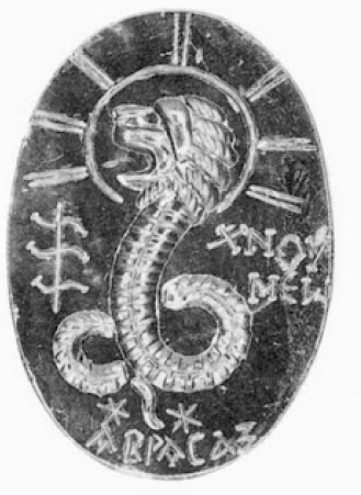 The symbol of Chnoubis, or the soul of the world, writes Champollion, “is among others that of an enormous serpent standing on human legs; this reptile, the emblem of the good genius, is a veritable Agathodaemon. It is often represented bearded … That sacred animal, identical with the serpent of the Ophites, is found engraved on numerous Gnostic or Basilidean stones. The serpent has various heads, but is constantly inscribed with the letters CHNOUBIS.”