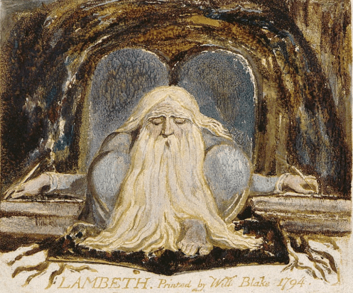 “Which is the Way/The Right or the Left“. Blake inscribed this gnomic question on one version of this striking design from the title page of The Book of Urizen, in itself suggesting the bifurcating world in which Urizenic thinking bases itself. All rational questions seem to invite the construction of reality into yes/no, left/right ways. This dualism – recalling that of the ‘Tree of Good and Evil’ – whose fruit bifurcates Adam and Eve’s mind – is reinforced in the symbolism of the image: the two stone tablets with arched tops like tombstones behind him, representing the fallen Mosaic Law; the roots splitting beneath him; and most strikingly of all he holds in his left hand a quill for writing (words), and in his left hand a brush or engraver for illustrating (images). Which hemisphere: left or right?