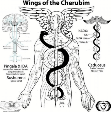 The Creation of Adam/ The Creation of Eve? Satan Exulting over Eve/Elohim Exulting over Adam? Left to Right/ Right to Left? “What was the nature of the serpent? Mystics intuitionally see in the serpent of Genesis an animal emblem and a high spiritual essence: a cosmic force superintelligent, a ‘great fallen light,’ a spirit sidereal, aerial and tellurian at the same time, ‘whose influence circumambulates the globe’.” The esoteric doctrine suggests that good and evil are profoundly intermixed and interdependent, rooted in the same source or entity. It depends on how you look at it: the idea of “contraries” – embodied in the double helix of the Brazen Serpent or Caduceus of Mercury/Moses which both devours and preserves, kills and heals, poisons and remedies. In cultures which forced a Cartesian separation of this one energy into two opposing beings (and believing in the triumph of one of them over the other), such ideas were blasphemous – hence in part the use of coded symbolism.