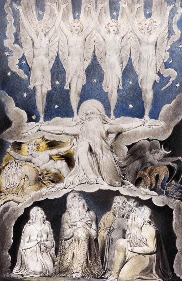 ‘The Angel of the Divine Presence Bringing Eve to Adam’ by Blake. Damon provides a penetrating insight into what the figure represents: “The Angel of the Divine Presence is Satan. He may take the form of an angel of Light and is often mistaken for God. As the unfallen Lucifer, he is the first of the seven Eyes of God.” In modern terms, he can perhaps best be understood as the Emissary, the left brain, who is also frequently mistaken for the ‘Master’ (in McGilchrist’s terms). The Book of Genesis is the account of how this power or process became “God”, signalling our Fall from the world of eternity and imagination, to the world of Nature and naturalism: the world of separation and generation. As both McGilchrist and Mark Solms suggest, the left hemisphere has a profound role in this process – as the “mediator”: it is a world not of Being but of ‘Representation’, or projected abstraction (‘Eve’) which these separated, fallen figures beautifully represent.
