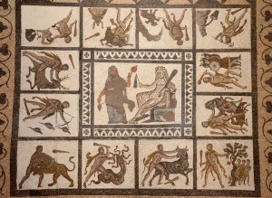 The 12 Labours of Hercules (mosaic, 3rd century AD). These “labours” or stages of transition involved Hercules encountering the Nemean lion, the Lernaean Hydra, the Erymanthian Boar, the Ceryneian Hind, the Stymphalian birds, the Girdle of Hippolyta, the Augean stables (Augeas is the early Greek name for Capricorn), the Cretan Bull, and the Mares of Diomedes. As a number of commentators have pointed out, the labours have strong connections to the constellations encountered by the transit of the sun through the year. Many are associated with the Zodiacal animals and often have an association with one constellation. As a whole, these stages on his journey represent the passage of the sun (personified as Hercules) through the year and the Zodiac. Hercules’s adventures start at the Zodiac constellation of Cancer (the constellation Hydra has its head near it), in which the sun’s solstice occurs, and passes through each Zodiac sign in the order the sun passes through them.