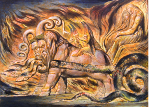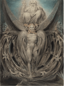 “The ‘God’ or centre of such a rationalising World is the Sun, the Solar Logos” (Image: ‘Satan in his Original Glory’ by William Blake). Blake constantly associated the figure of Satan both with the Sun or the solar consciousness that represents Urizenic, left-hemispheric thinking (as both Jung and Edinger also acknowledge), and also with the rationalising, ‘conscious’ Ego: “he is the Great Selfhood Satan: Worshipd as God by the Mighty Ones of the Earth”. “I have conversed with the Spiritual Sun—I saw him on Primrose hill”, Blake once told Crabb Robinson, driving home the demonic nature of the God of popular religion and science. “He said ‘Do you take me for the Greek Apollo?‘ ’No’ I said ‘that (and Blake pointed to the sky) that is the Greek Apollo—He is Satan.”