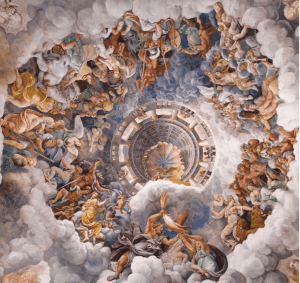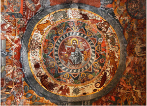 “A fundamental twelve-part division discernible in many facets of human life” (from top: wall painting of the 12 Olympian gods, by Giulio Romano, 1525–1535; Christ in the Centre of the Zodiac, Dekoulou Monastery, Greece, 16th century; the Dodecatheoi of the Babylonian clock). The division of the ecliptic into the zodiacal signs originates in Babylonian astronomy during the first half of the 1st millennium BC, at the same time Plato was exploring the twelve faces or “constellations’ of the dodecahedron in his Timaeus. From Babylon we not only get the Zodiacal calendar and the division of the solar year into 12 “months”, but also the division of the day into twelve “hours”, and the division of the hour into sixty “minutes” (the number of seconds in a minute, and minutes in an hour, comes from the base-60 numeral system of ancient Mesopotamia). That is to say, this Zodiacal structure is still how we navigate our place in both space and time. These astrological signs form a celestial coordinate system which shaped not only the universe but our actual psyches. They altered how we see, and therefore experience, space and time: as lineal and cyclical, for example – rather than, say, as an infinite and momentary Now.