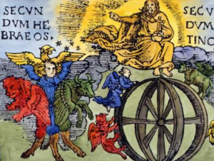 Záō or zṓon literally means “living” – a living creature (literally, “something alive”), though in the Bible, the term zṓon (“living creature”) is often mistranslated as “beast” (rather than “living being” or “living creature”). Interestingly, our word “influence” originally derives from and is rooted in this astrological framework, appropriately denoting the effect of this Zodiacal system on our psychological and physiological lives (it is technically an astrological term meaning “streaming ethereal power from the stars when in certain positions, acting upon character or destiny of men”, or an “emanation from the stars affecting one’s fate”). These embedded structures or ‘zoas’ are also, as Jung notes, our underlying drives – drives which literally “drive” the wheels of the Chariot, or Merkebah, through its various forms or “living creatures”.