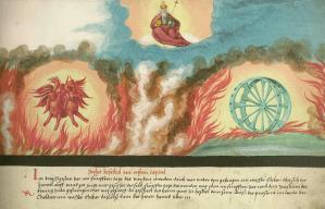 Mystic Wheel (The Vision of Ezekiel) by Fra Angelico (1451-2). The prophet Ezekiel is shown (bottom left), with St Gregory the Great (bottom right) in a mountainous landscape with the river Chobar running between them. In the top left of the panel is a text from the first book of Ezekiel outlining the prophet’s vision, which is shown below. Ezekiel leans back, his hands raised in surprise. His vision included four animalia who, ‘had one likeness: and their appearance and their work was as it were a wheel in the middle of a wheel’, (Ezekiel 1, v. 16). It is this wheel within a wheel which is shown here with a flaming circumference.