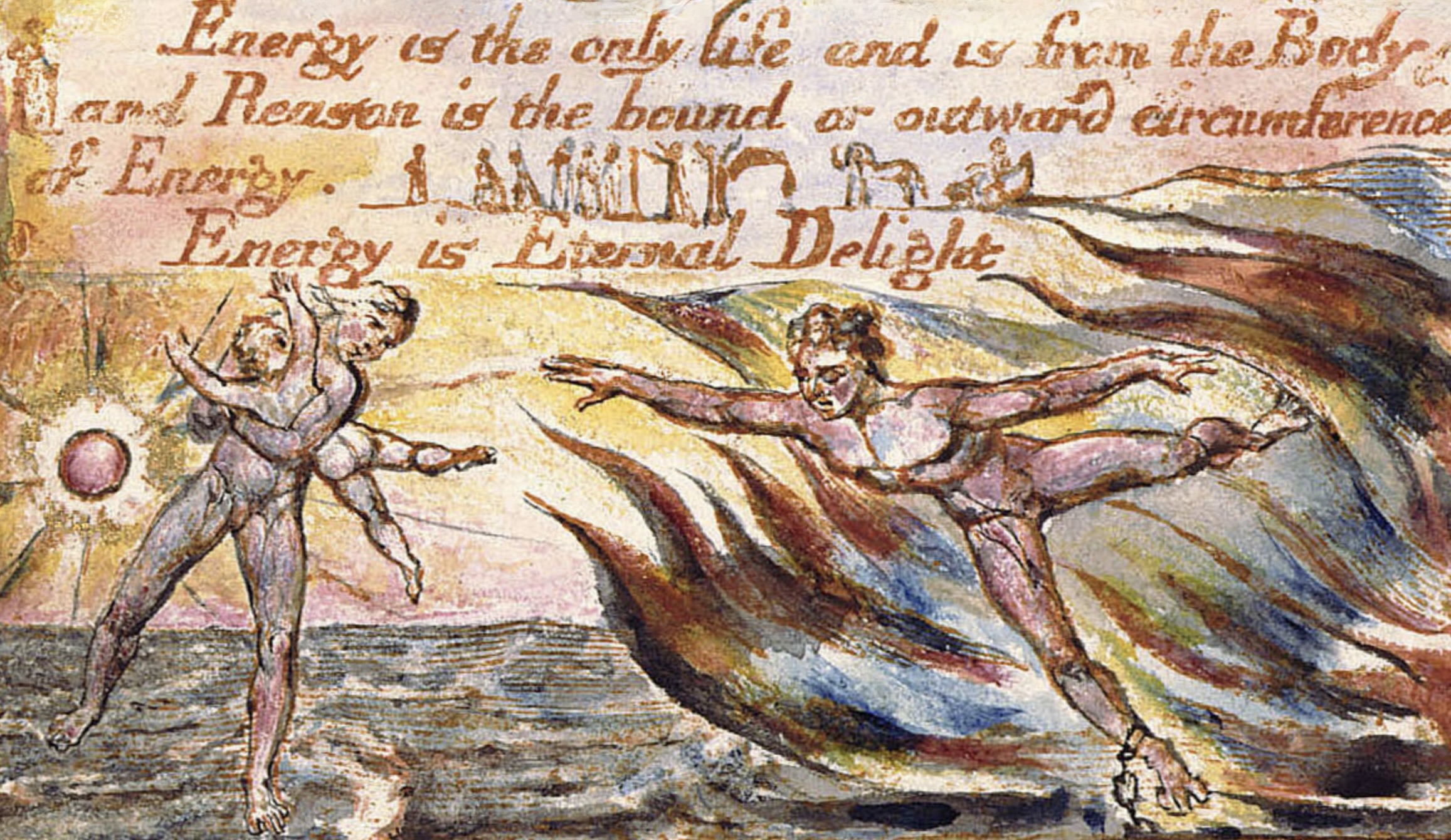 “Energy is Eternal Delight”. Where the figure of Newton is bent over, restricted, constricted, narrowly-focussed, fixated with his ratios and with what can be measured, Blake’s creative figures are expansive, bounding, arms and body flung open. As Blake notes on this same Plate, “Energy is the only life and is from the Body and Reason is the bound or outward circumference of Energy”: We need both, but only one participates in the energy and unexpected creativity of life itself.