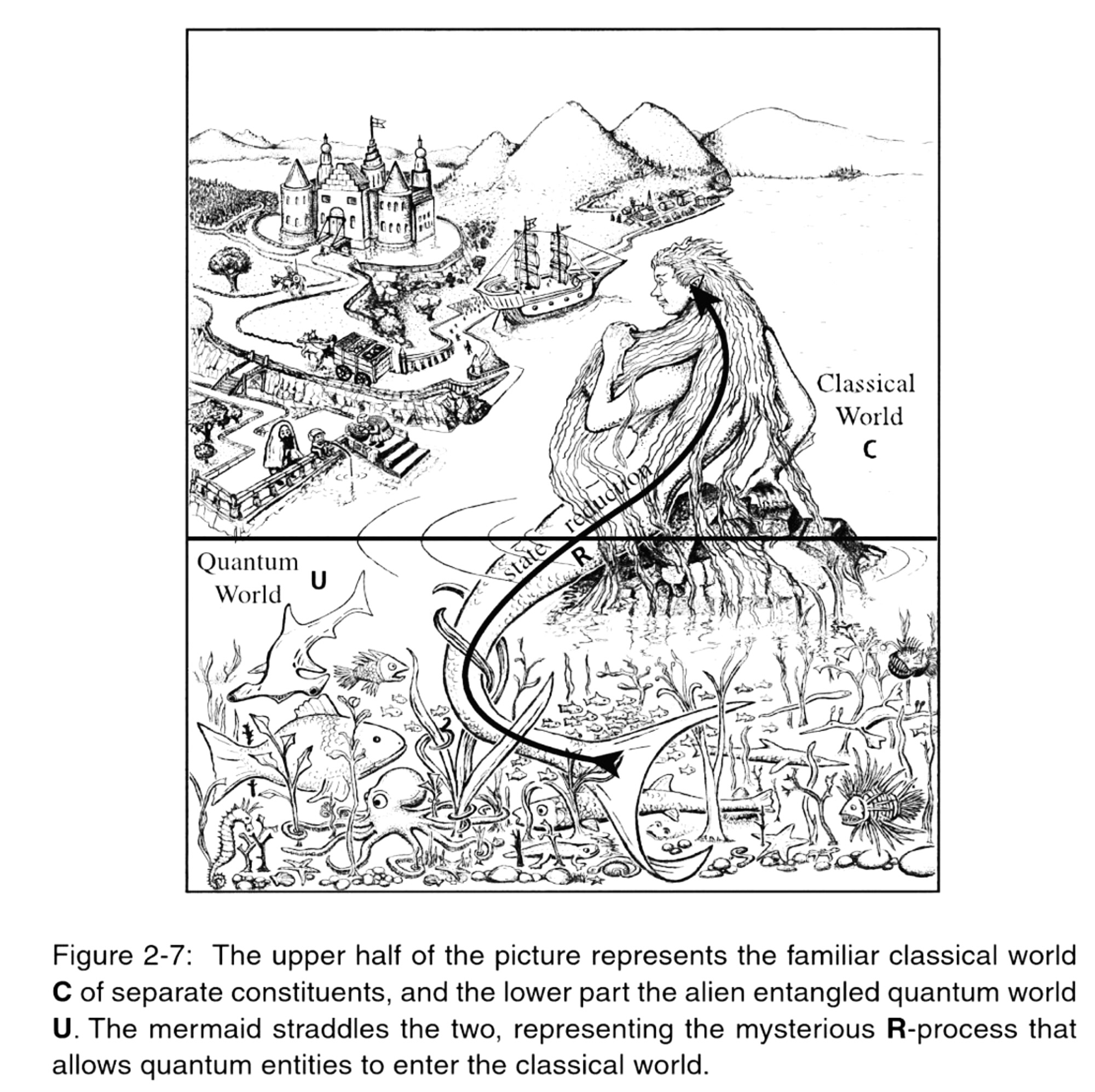 Penrose’s image of the mermaid to illustrate micro/macro relations. “The mermaid straddles the two, representing the mysterious R-process that allows quantum entities to enter the classical world.”