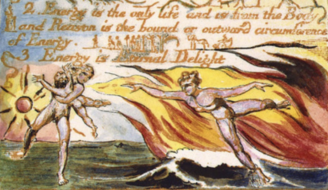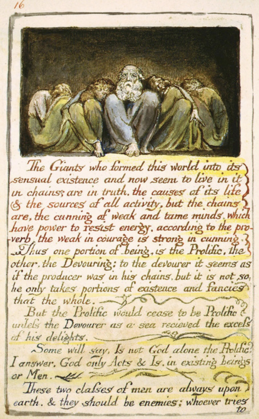 “The symbiotic conflict between these two classes of men is also an internal conflict within every individual, and is symbolized on plate sixteen in Blake’s discussion of the ‘prolific’ (energy) and the ‘devourer’ (reason/ratio).” The relation or dynamic between the two is never static or fixed, and they are perpetually brought into being by each other, a constant interplay between energy and form, container and contained. No one can control this, because control is itself only one part of the dialectic.