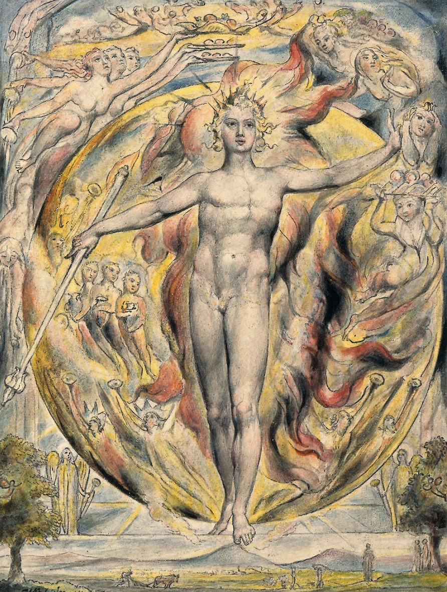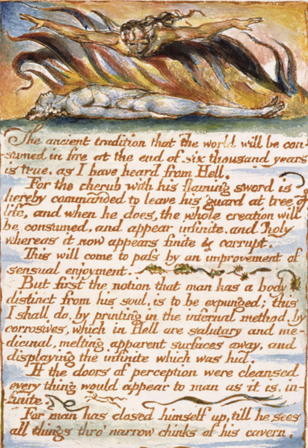 Most people operate only on the finite level, believing in the totality of their own created forms, but for humankind to reach its full creative potential it must regain contact with the infinite. Blake describes this process in the apocalyptic vision found on the fourteenth plate from which Huxley extracts the title Doors of Perception: “The ancient tradition that the world will be consumed by fire at the end of six thousand years is true, as I have heard from Hell, / For the cherub with his flaming sword is hereby commanded to leave his guard at the tree of life, and when he does, the whole creation will be consumed, and appear infinite. and holy whereas it now appears finite and corrupt. / This will come to pass by an improvement of sensual enjoyment. / But first, the notion that man has a body distinct from his soul, is to be expunged; this I shall do, by printing in the infernal method, by corrosives, which in Hell are salutary and medicinal, melting apparent surfaces away, and displaying the infinite which was hid, / If the doors of perception were cleansed every thing would appear to man as it is, infinite— / For man has closed himself up, till he sees all things through narrow chinks of his cavern”.