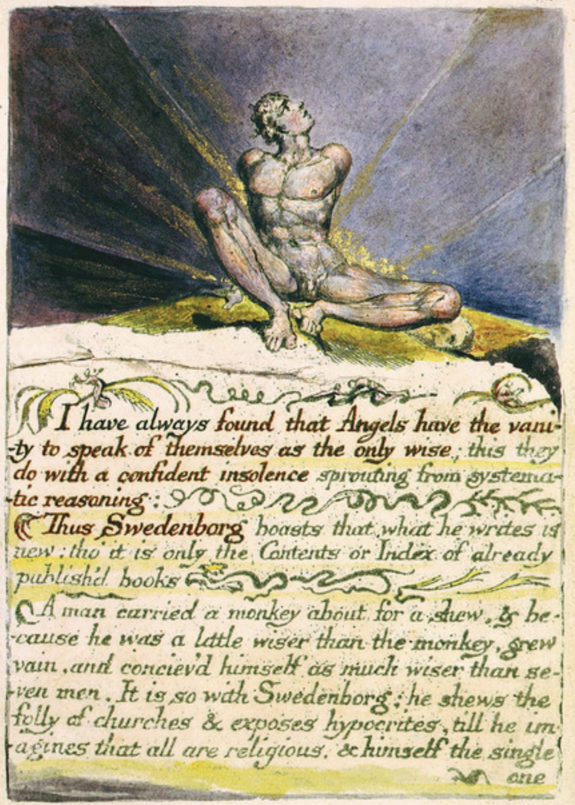 The Marriage of Heaven and Hell is a satiric parody of Emanuel Swedenborg’s Heaven and Hell. Consisting of twenty-seven illustriously engraved plates, it represents Blake’s rejection of the Swedenborgian model of good and evil, that holds human desire to be the source of all that is iniquitous. Drawing from a dogmatic reading of the Bible, Swedenborg writes, “it is plain from the first chapter of Genesis,—where it is said … ‘God saw everything that He had made, and behold it was very good,’—and also from the primeval state of man in Paradise, that everything God created was good. And it is plain from the second state of Adam … that evil arose from man”. The logical extension of this mode of thought, that mankind’s free will and creative abilities are curses rather than blessings, and should be restrained, is a notion that Blake found reprehensible.