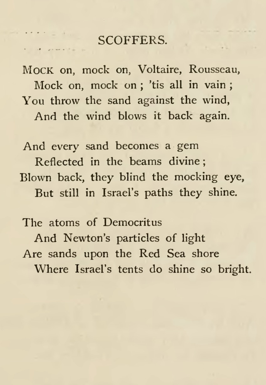 “The Atoms of Democritus/ And Newton’s Particles of light/ Are sands upon the Red sea shore/ Where Israel’s tents do shine so bright” – from Blake’s Notebook (E 477), printed in Gilchrist’s Life of Blake. In a late letter, Blake referred to “An Atom”, the basis of the building-block materialist mechanism universe, as “A Thing that does not Exist” – as indeed it does not, in the literal sense (a-tomos, meaning “not cuttable” or dividable). A ‘sub-atomic’ particle may be a way of rescuing this desperate desire to believe in some sort of fundamental building blocks – the Urizenic Rocks which are the basis of its world – but is an etymological nonsense. The question is, then what are they? Are they anything? Are they openings?