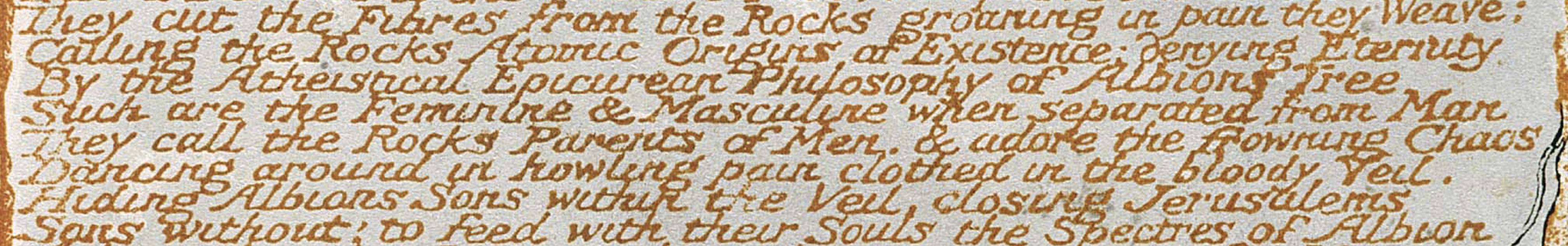 The symbiotic conflict between these two classes of men is also an internal conflict within every individual, and is symbolized on plate sixteen in Blake’s discussion of the “prolific” (energy) and the “devourer” (reason/ratio). The relationship between the two is the perfect model of Blakean contraries, as the two are entwined in an interminable state of conflict in which the prolific perpetually creates in the immediate media of life and energy while the devourer deadens his creations by imprisoning them in a system of symbols.