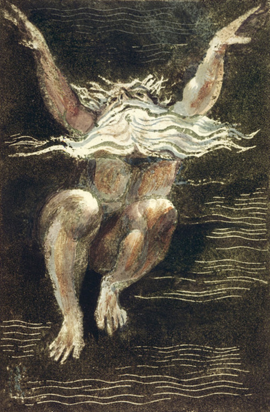 Poor old Urizen. Finding itself in a world of constant flow and living fluidity – rather like being in an LSD trip – in which each part is contained in all, and all parts are infinite, and we’re in all of them as well, the rational egoic thinking program feels utterly overwhelmed – as we see here – and starts to laboriously construct an Ark – actually a mind-forged Prison – to protect itself from life. The design may depict Urizen’s report that he “repell’d / The vast waves, & arose on the waters / A wide world of solid obstruction” (Plate 6). Urizen sees the world now as something to overcome – to fight, control, struggle against – he transforms it into a vast threatening Dragon – and sees itself as a noble, pure, disembodied (or ‘spiritual’) Reason whose business it is to harness, control, and drain that sea.