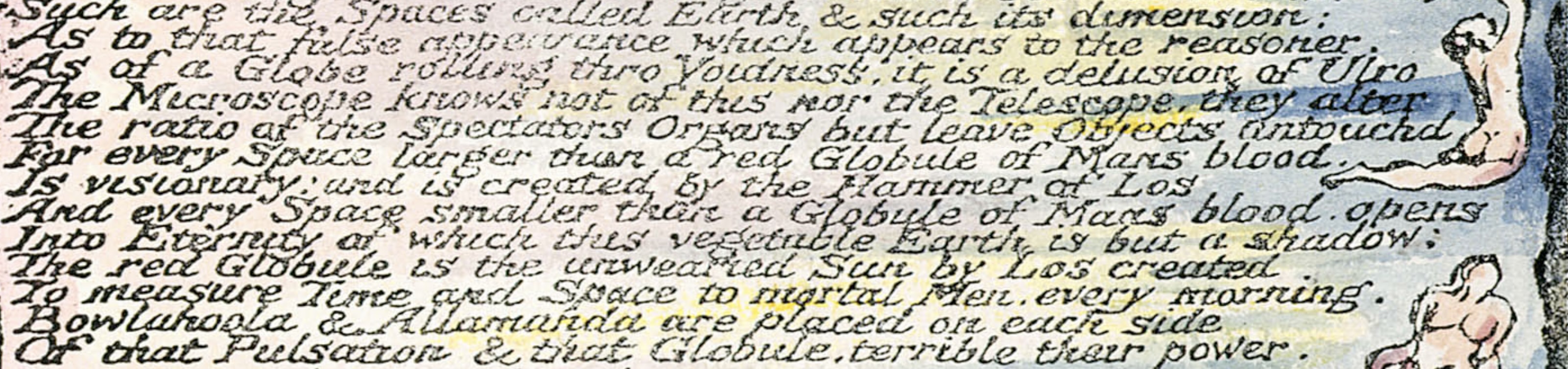 Eternity inside a globule of blood: “The microscope knows not of this nor the telescope: they alter/ The ratio of the spectator’s organs, but leave objects untouch’d. / For every space larger than a red globule of Man’s blood / Is visionary, and is created by the Hammer of Los; / And every space smaller than a globule of Man’s blood opens / Into Eternity” (Blake, Milton, Plate 28). As John Higgs suggests, Blake’s perception of such a domain beyond the ratios of memory and the conditioned conceptual mind (‘urizen’) bears striking similarities with some aspects of modern quantum field theory, such as a space “where Contrarieties are equally true”, where the observer altering his eye alters the objected perceived, and where issues of time, finitude, and measurement no long apply (Higgs, William Blake vs the World).