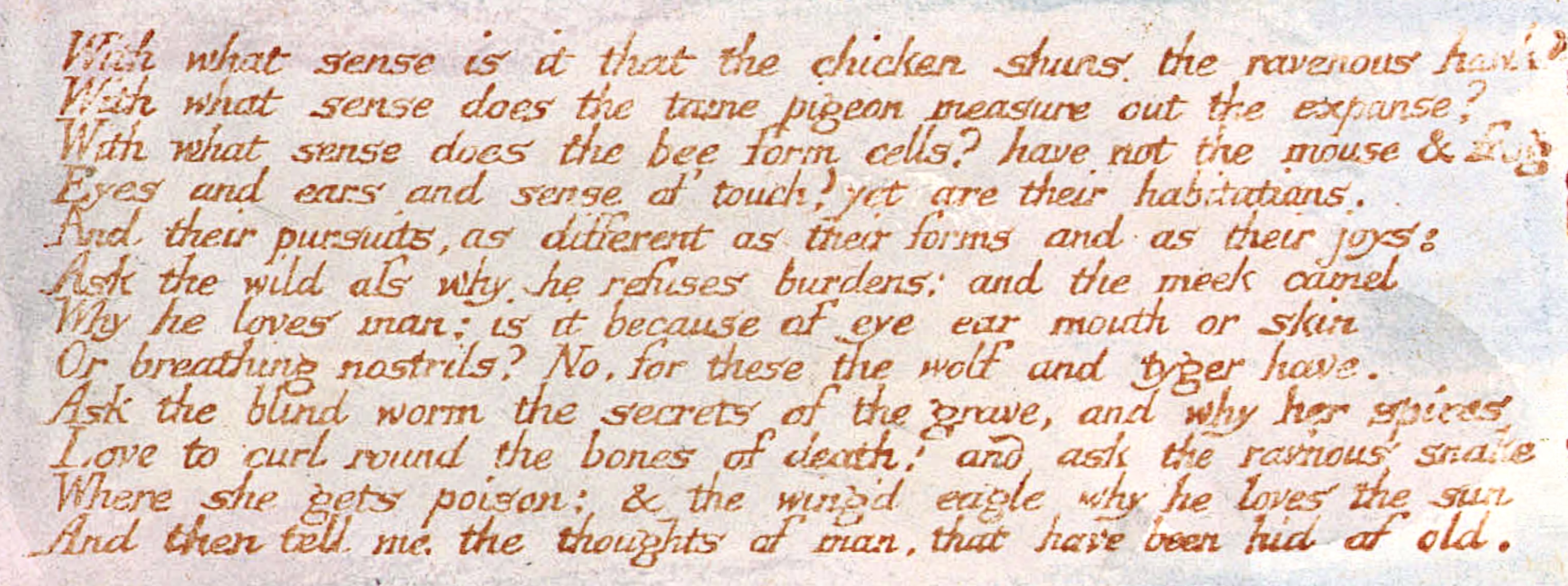 What is removed by the vessel, however, can be restored by a perception that transcends symbols and encounters the idea immediately. By arguing that mortal creation takes place on some level beyond finite perception, Blake is making the weighty claim that human perception can also exist on an infinite, or even divine, plane. This claim is in direct contention with the dogmatic vision of the Swedenborgian devourers of the world, who hold sacred the separation of man and God. Blake addresses his critics, asserting, “some will say, Is not God alone the Prolific? I answer, God only acts & Is, in existing beings or Men”, and in doing so exposes a flaw in Swedenborg’s reasoning: if all of God’s creations are good, and man is God’s creation, is not man’s desire also created by God and therefore good? That man is the possessor of infinite desire, and can conceive of a God, is proof enough for Blake that there is a portion of God in man because nothing infinite could be contained by something that is solely finite.