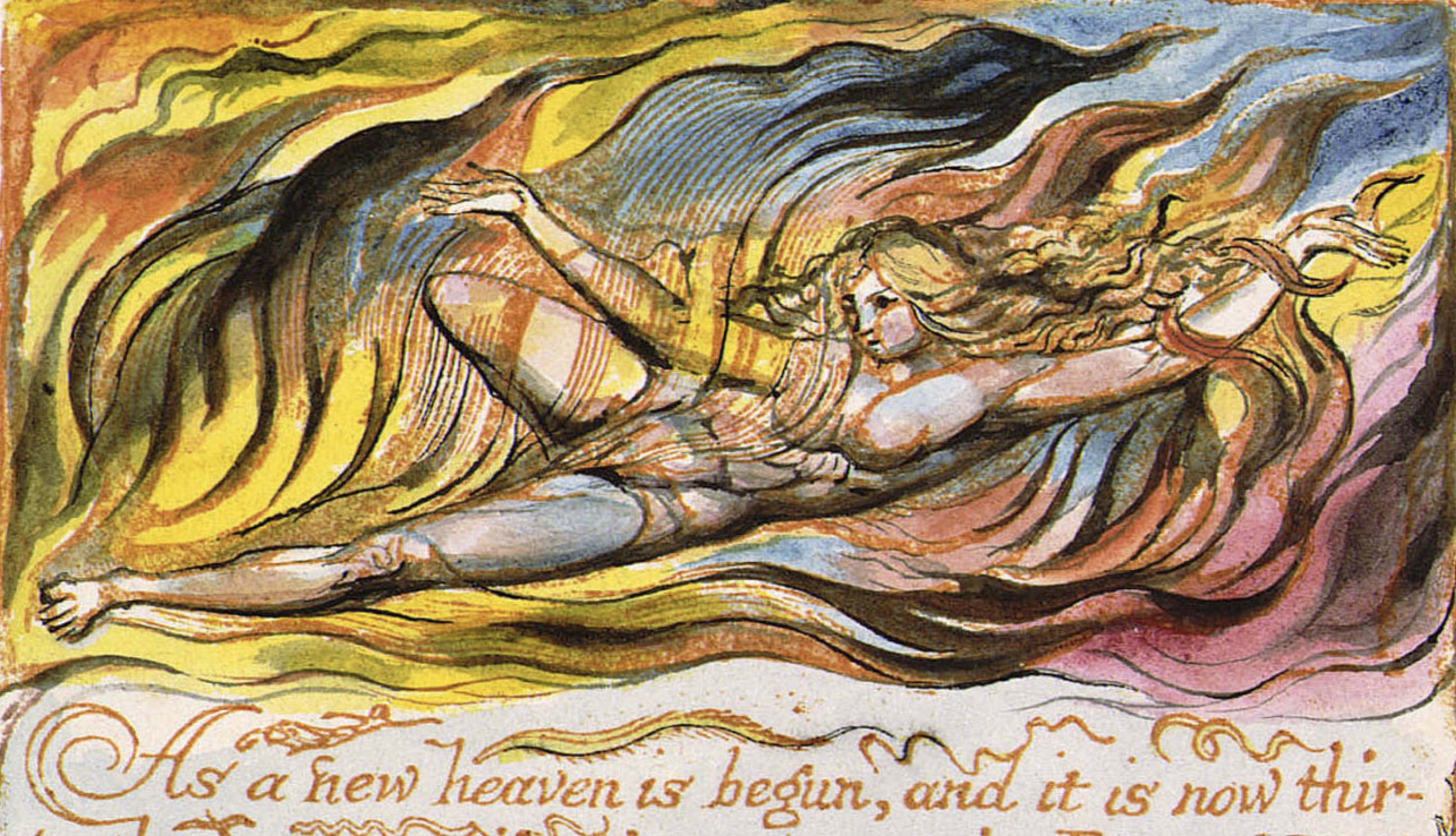 Beneath a depiction of the liberated soul rejoicing in the infernal flames, Blake writes on the third plate—“Without contraries is no progression. Attraction and repulsion, Reason and Energy, Love and Hate, are necessary to Human existence / From these contraries spring what the religious call Good and Evil. Good is the passive that obeys Reason Evil is the active springing from Energy”. The idea that contraries are the essence of human progression is central to Blake’s thesis, and carries with it the fascinating intimation that the triumph of good over evil is not a desirable end, although this point has frequently been misinterpreted. Clearly the labels “good” and “evil” are being applied sarcastically to restraint and desire, as the necessity of both negates the worth of any absolute value judgment. Rather than creating moral distinctions, Blake’s work deconstructs what Swedenborg considered evil, and finds it to be the soul of creation, and the primary source of vitality in human existence.