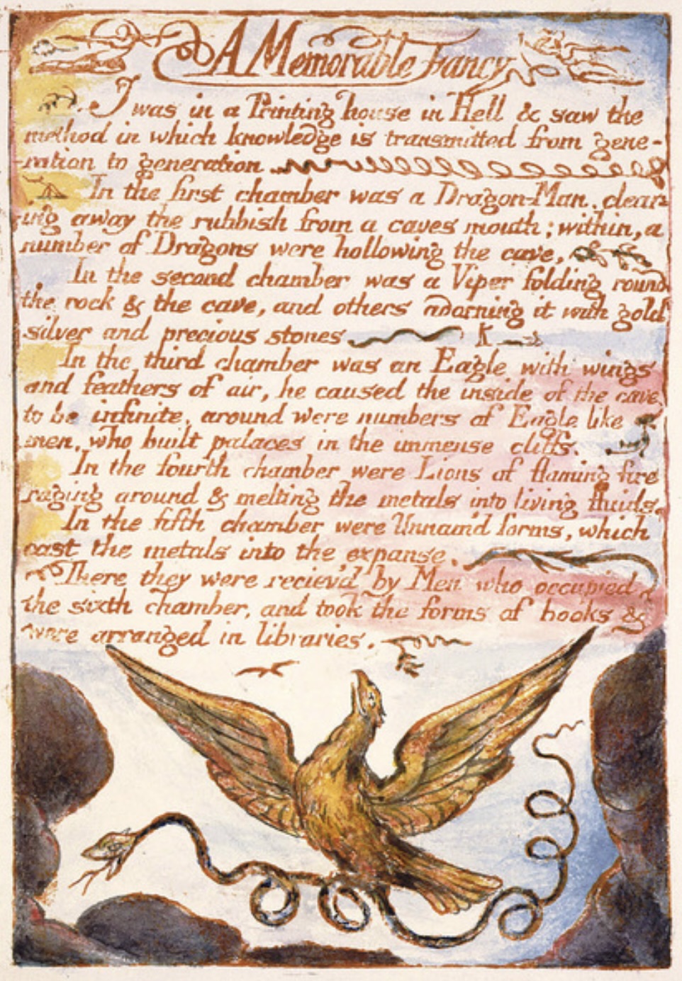 In the ‘Memorable Fancy on the fifteenth plate’, Blake visits a printing house in Hell and sheds further light on the process of infernal creation.